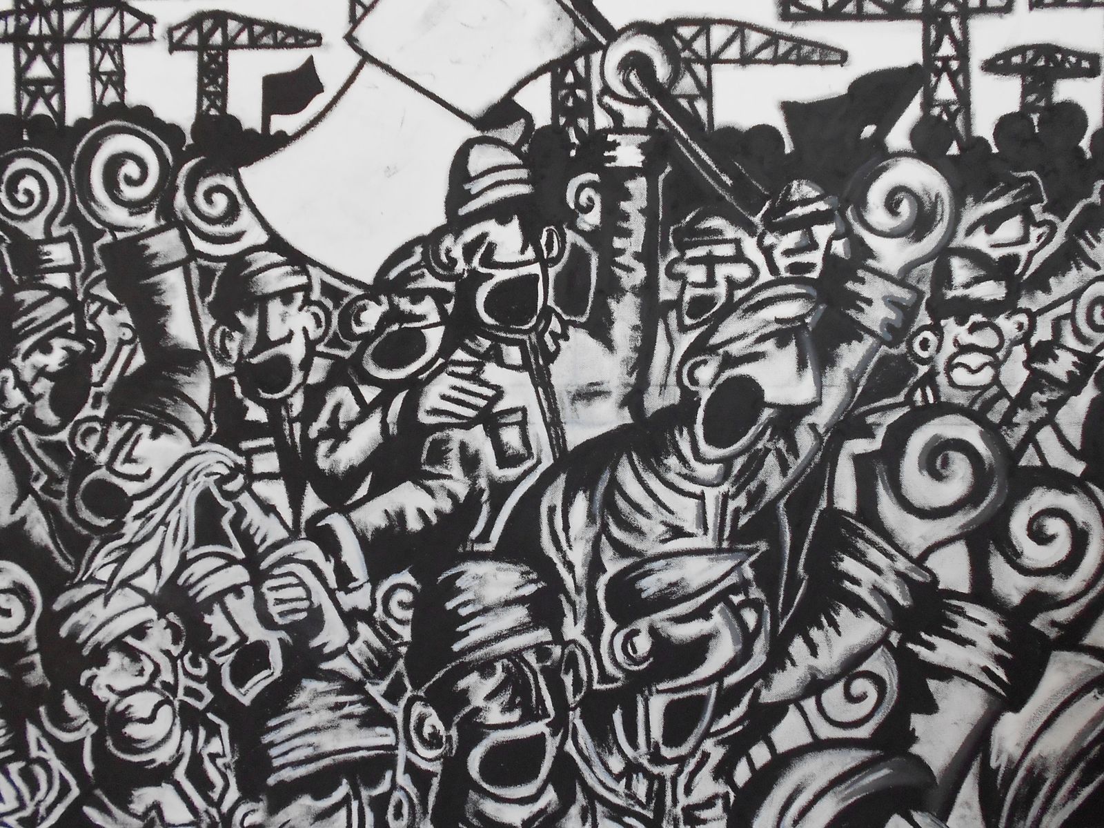 Guitariste du Massilia sound system, guitariste et banjoïste de Moussu T e Lei Jovents, BLU a sa ville de La Ciotat chevillée au corps avec en toile de fond l'histoire des chantiers navals qui l'inspirent. Les chantiers, mais aussi les ouvriers et leurs luttes. Traits forts, noirs, affirmés comme un slogan qui fouette le silence, ses oeuvres (craies grasses, acryliques et stylo bic) sont à la frontière de la bande dessinée et de l'affiche.